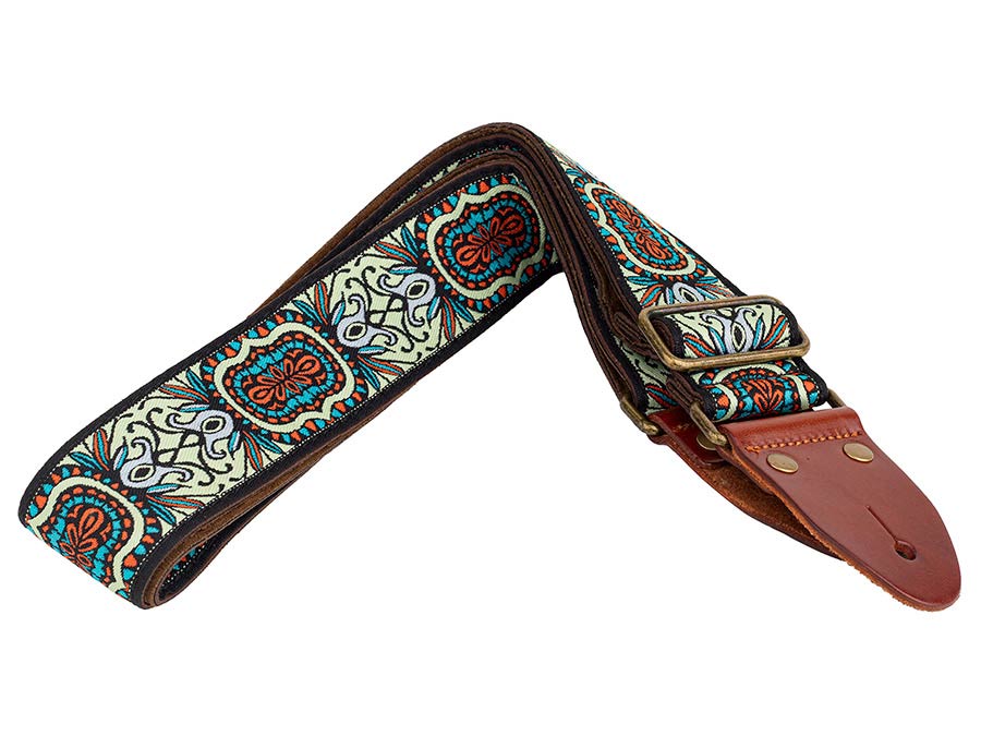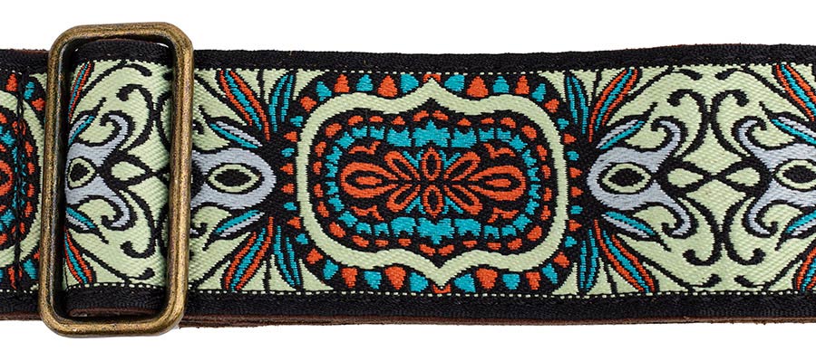 guitar strap, 2" jacquard weave, leather slips with pins, brass buckle, suede backing, multi colors