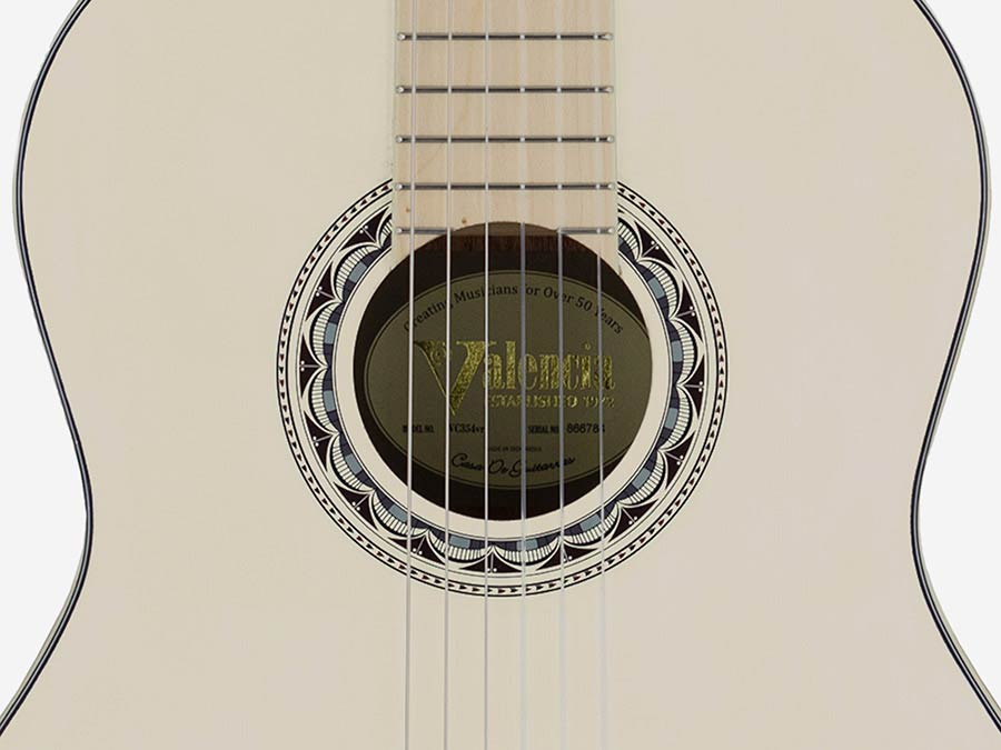 The Valencia 354 brings a fresh look to the classical guitar world. With its vibrant, multi-colored top and matching headstock, this full-size 4/4 guitar has a striking presence. The white fretboard, paired with rich mahogany back and sides, creates a unique contrast that makes the colors stand out even more. But beyond its bold design, the 354 is a solid, comfortable instrument for players who want a reliable classical guitar with a touch of personality.