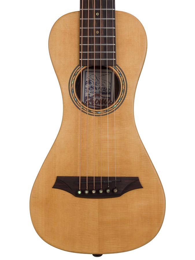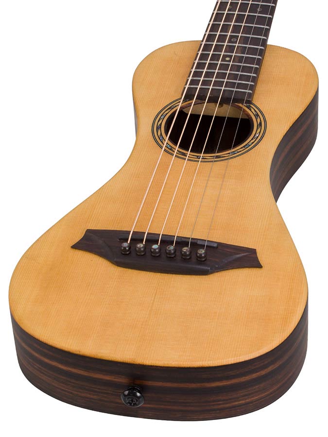 all solid traveller guitar, spruce top, amara ebony body, piezo, satin, strap, heavy duty bag