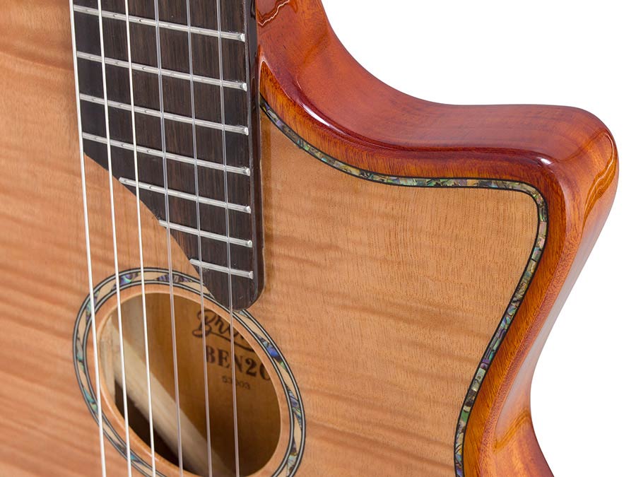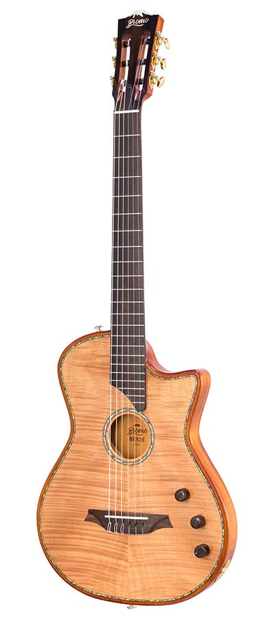 The Bromo BEN2C Fusion Craft Series electric nylon string guitar blends classical tone with modern innovation. Ideal for both fingerstyle and strumming, it fuses nylon strings with a sleek, ultra-thin 42mm (1.65”) body featuring a cutaway, ergonomic belly contour, and smoothly radiused body edge, along with a C-profile, slim 48mm (1-7/8”) neck paired with an innovative Comfy Nut and a 400mm (15.75”) fretboard radius. This design delivers unparalleled playability for classical guitarists - something traditional classical guitars can't match - while also offering instant familiarity for acoustic and electric players crossing over.