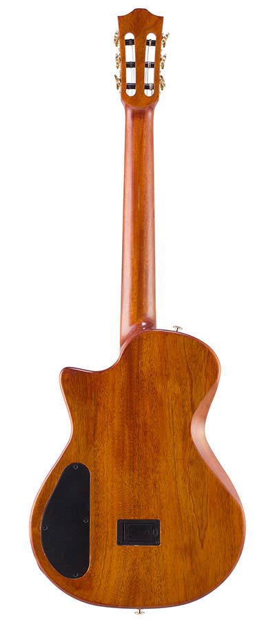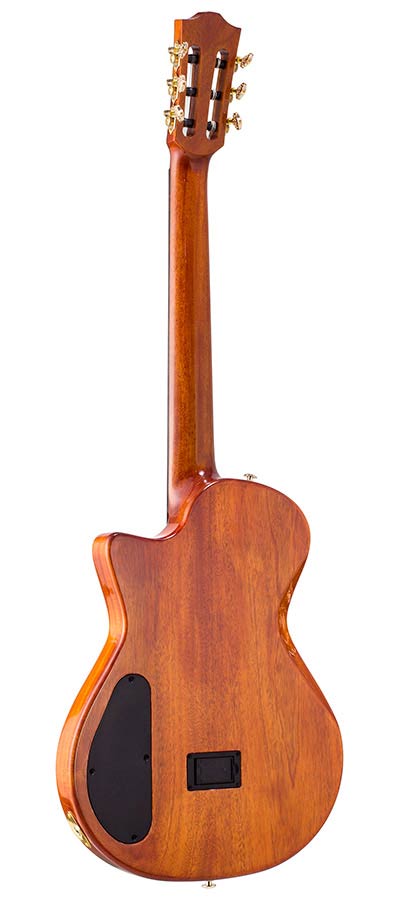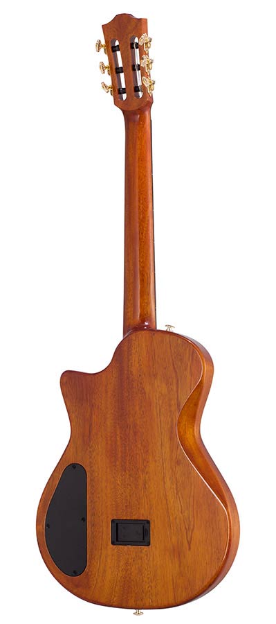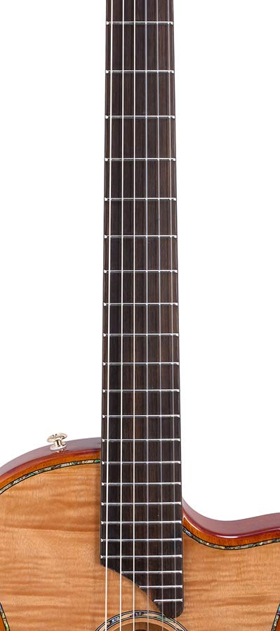 ?With a solid spruce top veneered with 5A-grade flame okoume, a fully chambered mahogany body, and an innovative sculpted bracing system, it delivers a sound that is rich and resonant enough for home practice, while minimizing feedback on stage. Combined with the guitar’s hybrid pickup system - an under-saddle piezo pickup and a 3-head under-bridge transducer featuring versatile sound options – this guitar is a top pick for performing artists.