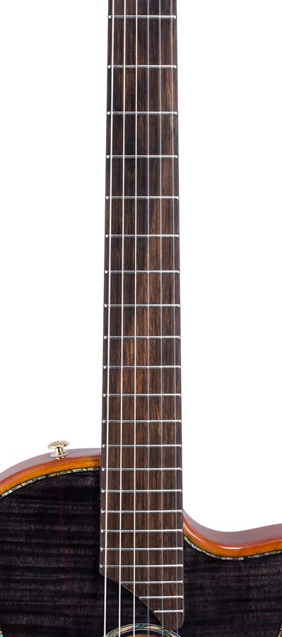 ?With a solid spruce top veneered with 5A-grade flame okoume, a fully chambered mahogany body, and an innovative sculpted bracing system, it delivers a sound that is rich and resonant enough for home practice, while minimizing feedback on stage. Combined with the guitar’s hybrid pickup system - an under-saddle piezo pickup and a 3-head under-bridge transducer featuring versatile sound options – this guitar is a top pick for performing artists.