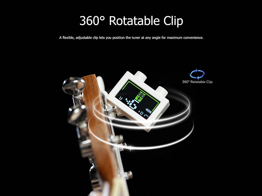 - 360° Rotatable Clip - A flexible, adjustable clip lets you position the tuner at any angle for maximum convenience.
