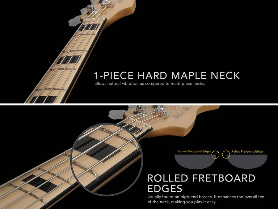 Premium Swamp Ash tone wood is usually found in higher priced instruments. Swamp Ash tone wood is known to produce a well-balanced tone. It is highly resonant and offers a nice balance of pleasant highs, firm lows, and a slightly scooped midrange which is great for slap playing.The characteristics of this wood enable players to emulate Marcus Miller’s tone a step further.