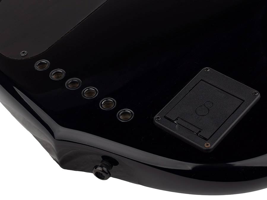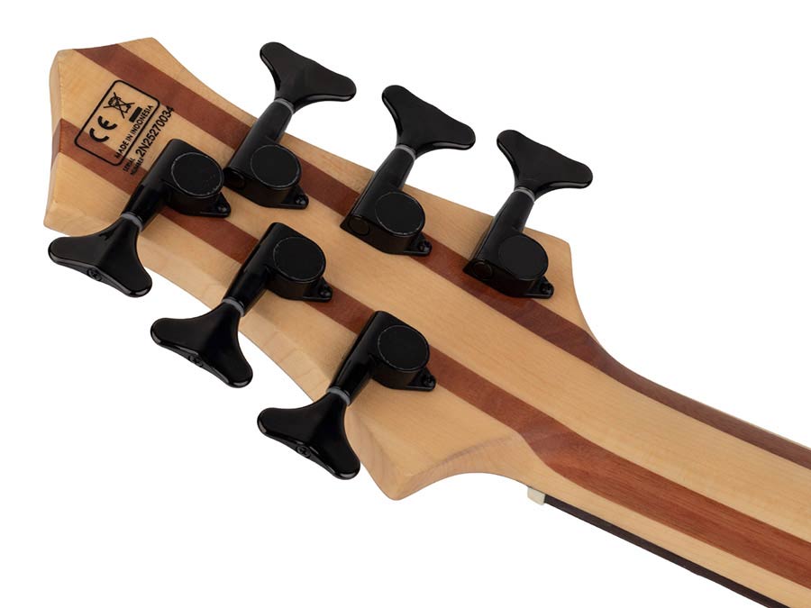 Contemporary bass shape made of North America Alder known to express fine-tuned qualitybuild and sound in an instrument; topped with solid flamed Maple for luxurious finish. Its neck is made from 5-piece wood (Maple/ Mahogany) complementing highly tensioned 6 strings paired with Rosewood fingerboard.