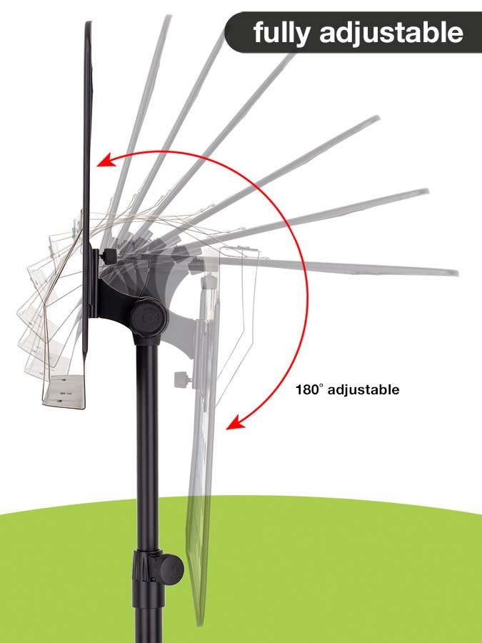 De lessenaar heeft een zwart geperforeerd blad en is traploos in hoogte af te stellen. De kanteling van het blad is gemakkelijk af te stellen met een robuuste kunststof draaiknop. Hij is uitgerust met een stabiele 3-poot voorzien van kunststof doppen voor optimale grip en bescherming van de vloer.