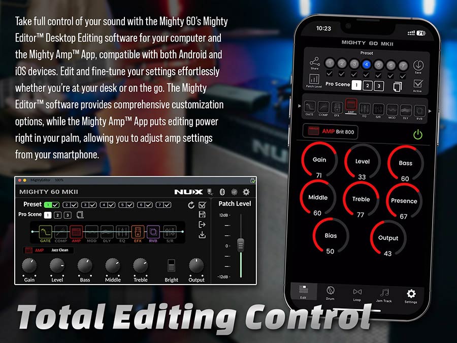 Elevate your sound and versatility with the NUX Mighty 60 MKII—your ultimate companion for practice, performance, and recording.