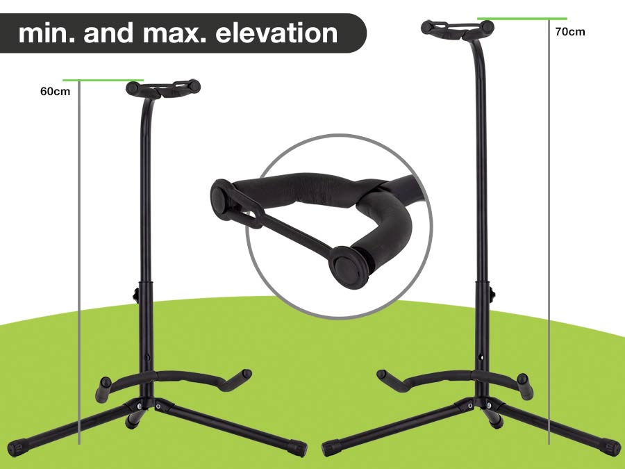 De hals van uw gitaar kan worden vastgezet zodat hij bij een stootje niet uit het statief kan vallen. De steunpunten waar uw gitaar op rust zijn voorzien van rubberen beschermlagen zodat uw gitaar niet beschadigt.