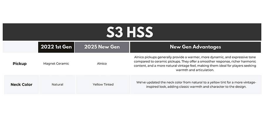 The traditional HSS-style S-shaped electric guitar for a great value is now enhanced with significant features to ensure superior performance and stretch to its life span. The S3 HSS New Gen is now designed with trendy colors and has a robust port to meet the demands of modern players.