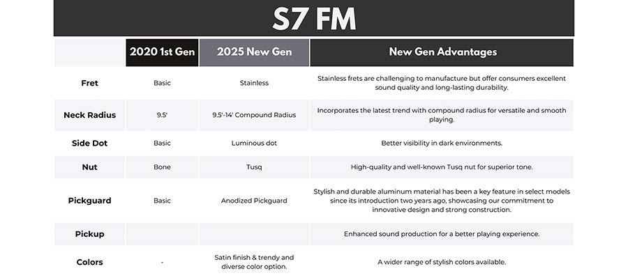 More than just aesthetics, the S7 FM New Gen is enhanced with significant features to ensure superior performance and stretch to its life span. It is built with upgraded components such as the newly tuned Sire Larry Carlton pickup set for refined tonal versatility, stainless frets, some more neck features, and new colors, making the playing experience even more exceptional this time.