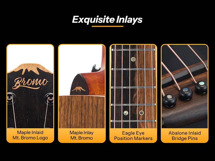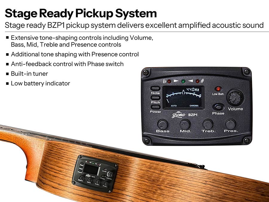 The Electric Acoustic models feature an under-saddle pickup, and a four-band Bromo EQ (low, mid, high, presence) with built-in tuner, ideal for live performance and recording.