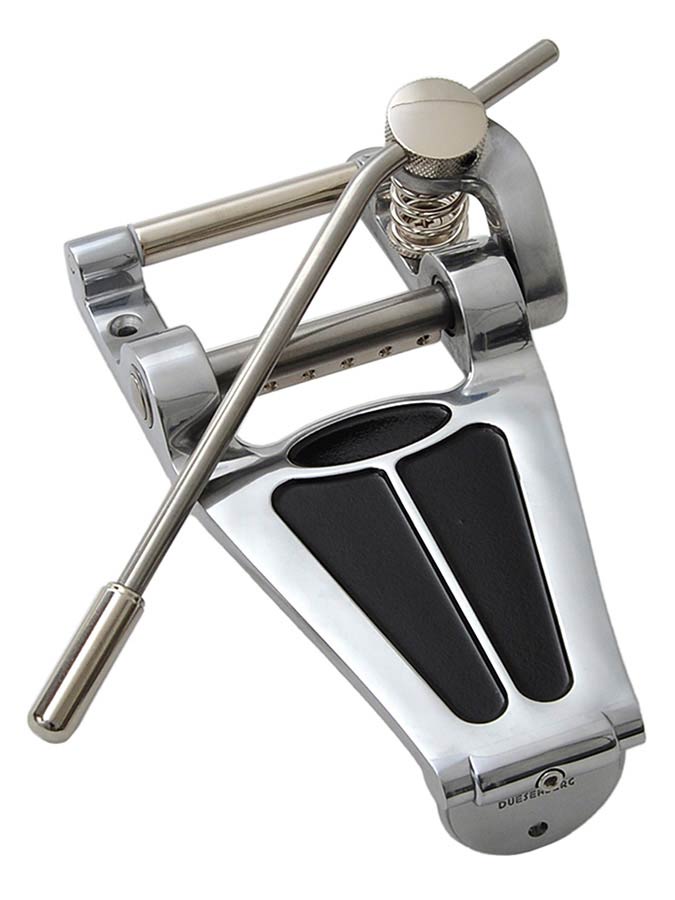 Inspired by the Duesenberg Diamond Deluxe Tremola. Identical in function and material quality! An aluminium frame ensures excellent transmission of the resonances, high-quality bearings allow the well-known smooth tremolo action and ensure optimum tuning stability. The 360° rotatable round arm can be adjusted in length, response, position and movement. Easy string change due to holes in the axis. As easy as stringing a stop tailpiece guitar. Simply the best!