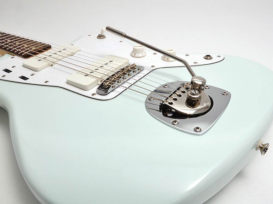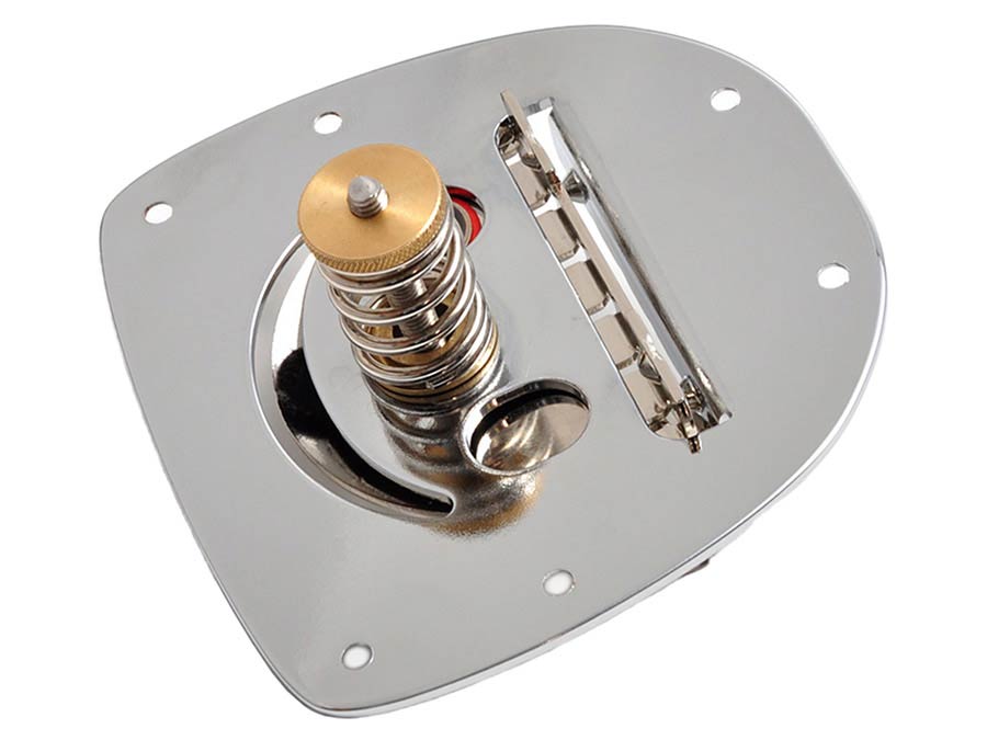 Our tremolo for Jazzmaster and Jaguar type guitars is the only one on the market that is technically not a copy of the Fender system, but can still be mounted 1:1 without milling, drilling and modifications and offers all the advantages of the göldo DG1 tremolo series: buttery smooth movement equally in the "up & down" operation including adjustable zero point by spring preload.