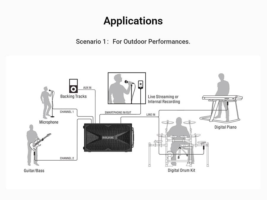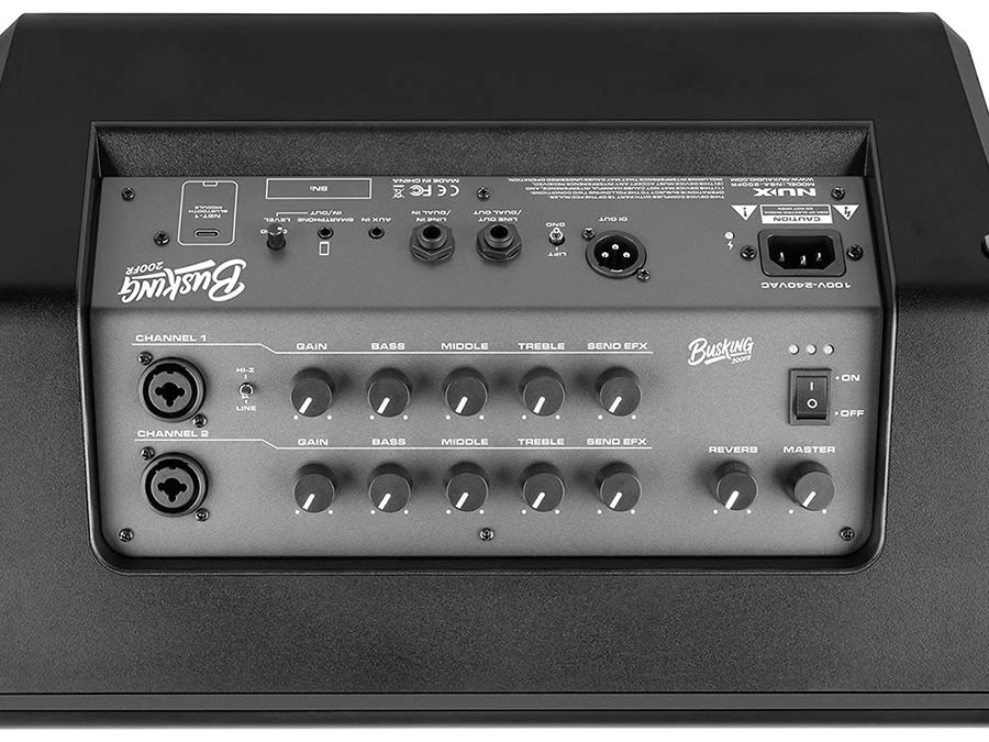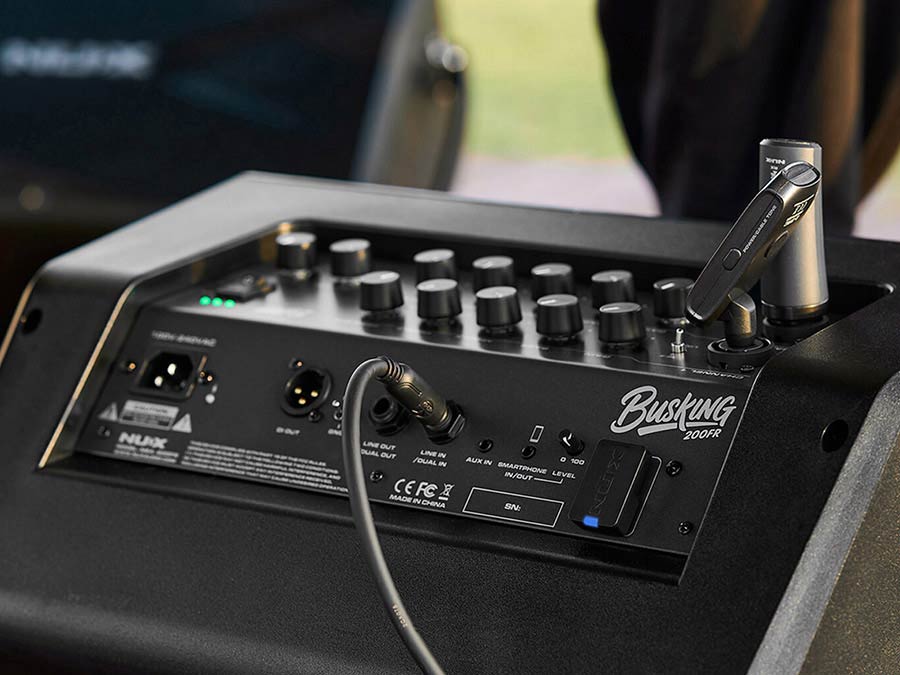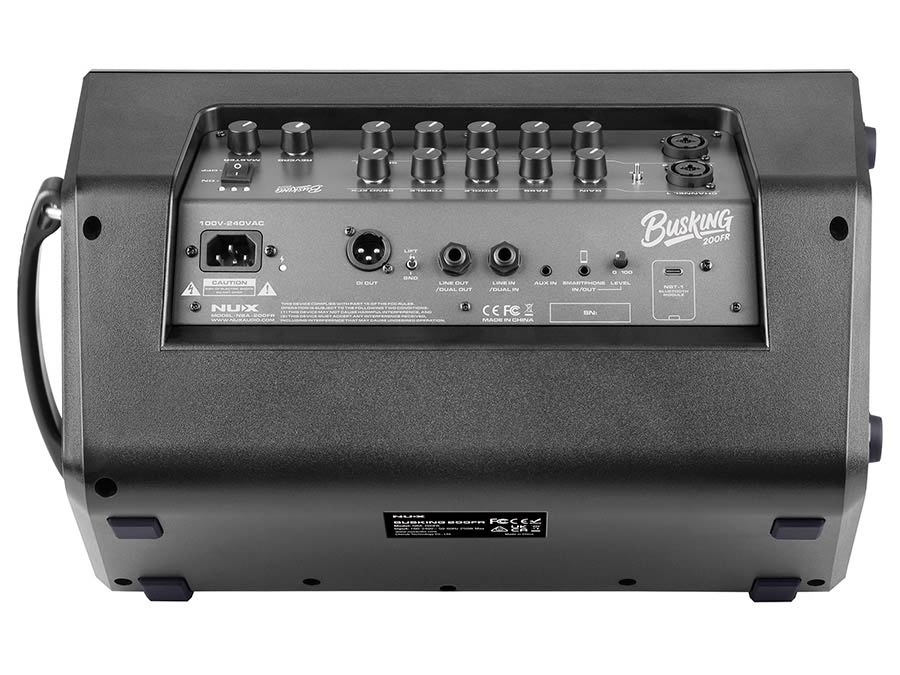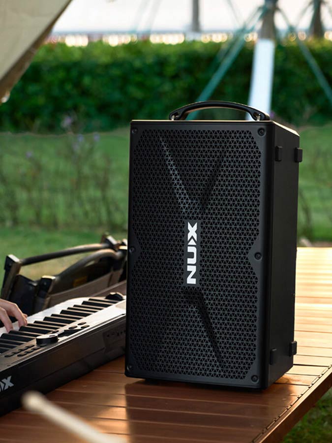 The NUX Busking 200FR is a portable full-range PA built for outdoor use, street performance and small-venue work. It uses a premium 8" full-range speaker plus two 3" tweeters and is driven by a Class-D amplifier — design intent: clear, balanced sound without heavy processing.