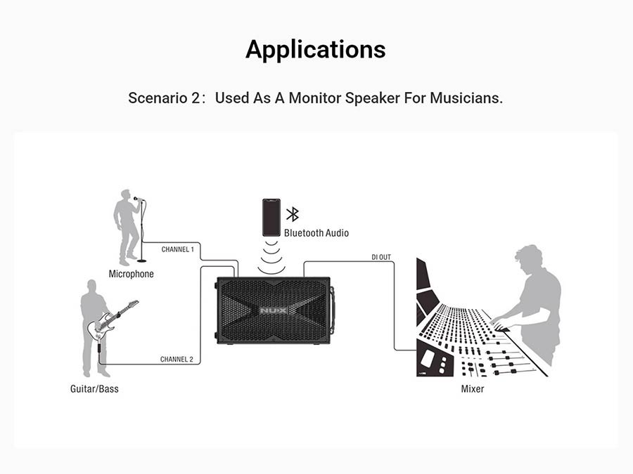 The front panel provides two independent analog channels with dedicated EQ and a simple digital reverb — enough control for common live setups without a learning curve. It supports microphones, Hi-Z instruments, line sources, and smartphone streaming/recording. Bluetooth playback is available via the included NBT-1 module. These user-focused features reduce setup time for non-technical performers.