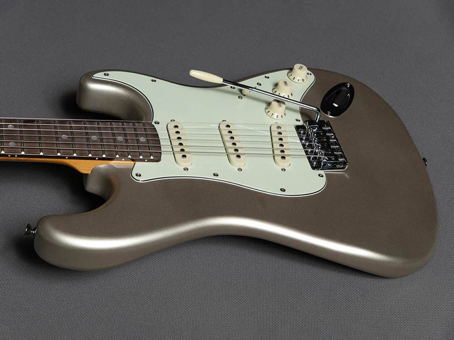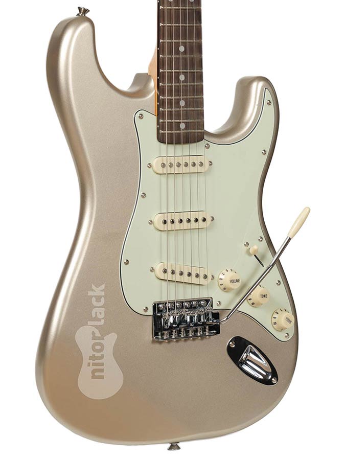 Inspired by the new Pontiac cars from 1959, Shoreline Gold was introduced as a Fender custom colour option until late 1965. It was then replaced with Firemist Gold.